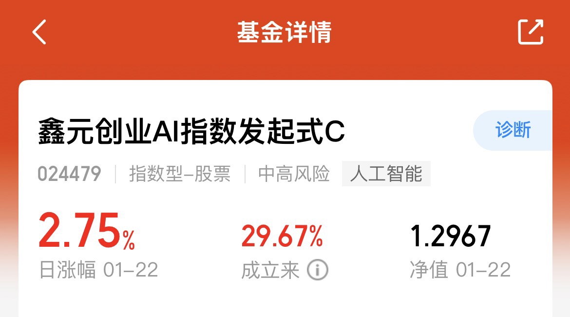 $鑫元创业AI指数发起式C$拉红回血啦!近日涨2.75%,最新净值1.2967,