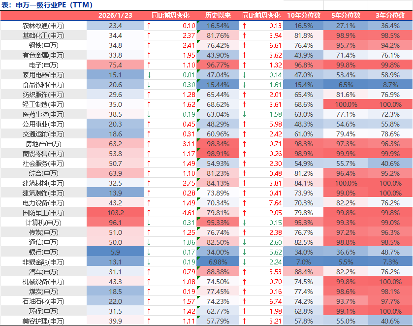 表2:上周A股市场申万一级行业PE(TTM)