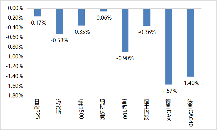 上周海外股市涨跌不一。美国股市方面,道指下跌0.53%,标普500下跌0.35%,纳指下跌0.06%;欧洲股市方面,英国富时100下跌0.90%,德国下跌1.57%,法国下跌1.40%;亚太股市方面,日经指数下跌0.17%,恒生指数下跌0.36%。