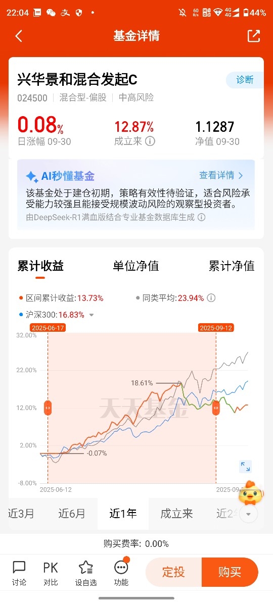 随着时间推移,兴华景和混合发起C的配置逻辑逐渐清晰。它聚焦的高端制造、工业机械领域,恰是中国产业升级的核心赛道,那些被纳入持仓的"专精特新"企业,正符合其"自下而上选个股"的策略。这种布局在9月开始显现效果:9月16日单日上涨1.16%,9月29日再涨0.59%,截至9月30日净值升至1.1287。复盘我的定投账户,累计收益率已达8.2%,远超同期一次性买入的收益,这让我深刻体会到:选对契合长期趋势的基金,定投才能发挥复利魔力。
