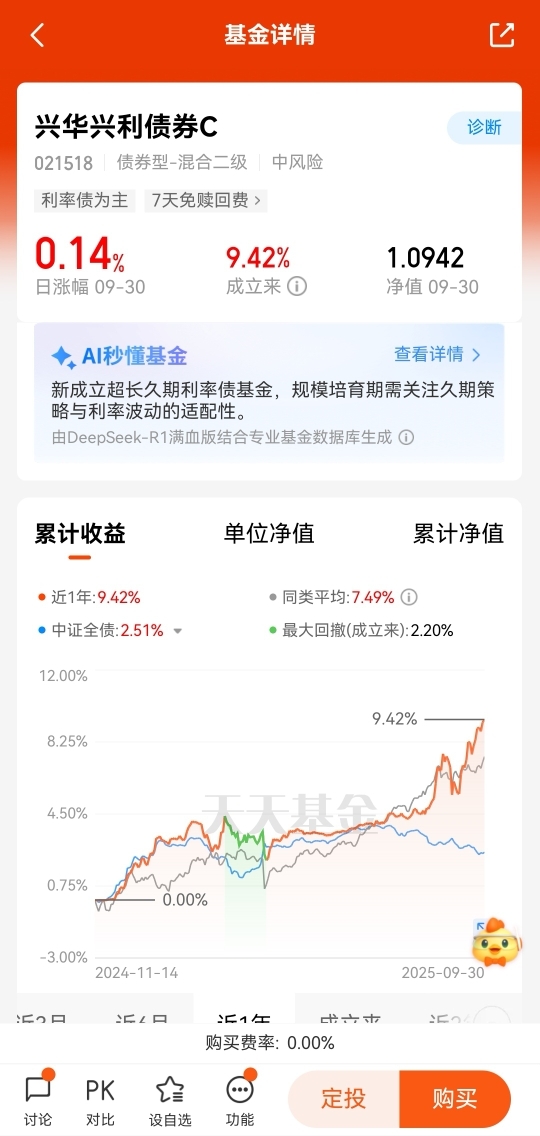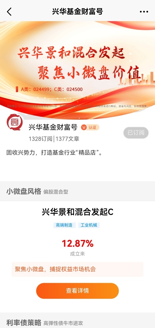 当然了长期投资并不是说非要去经历这样的亏损再盈利的局面,有的时候选择一些安全边际相对较高的资产,也会有不错的回报,$兴华景和混合发起C$ 精选高端制造领域的小微盘企业,成长潜力足,弹性空间大,符合当下时代发展趋势,$兴华兴利债券C$ 固收明星,以超长久期利率债券叠加信用债等为大头底仓,稳健风格突出,同时搭配部分权益资产进行进攻,主要选择当下火热且行业前景可观的机器人、半导体芯片等先进制造产业,强进攻性带给固收+资产不错的弹性空间,如此一来,也让基金本身具有可进可攻退可守的双重特性,既有一定的风险预警,也能够获取到较为不错的投资回报。