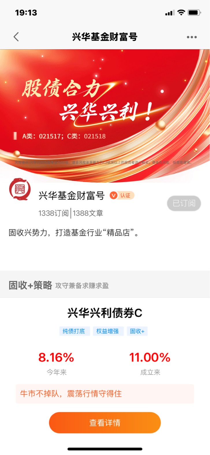 在实际操作中,我倾向于将兴华景和作为权益类资产的配置部分,搭配兴华基金旗下的其他产品构建投资组合。比如可以用$兴华兴利债券A(OTCFUND|021517)$这样的"固收+"产品作为稳定器,再用兴华安裕利率债作为防御性配置。这样既能追求收益,又能控制整体风险。