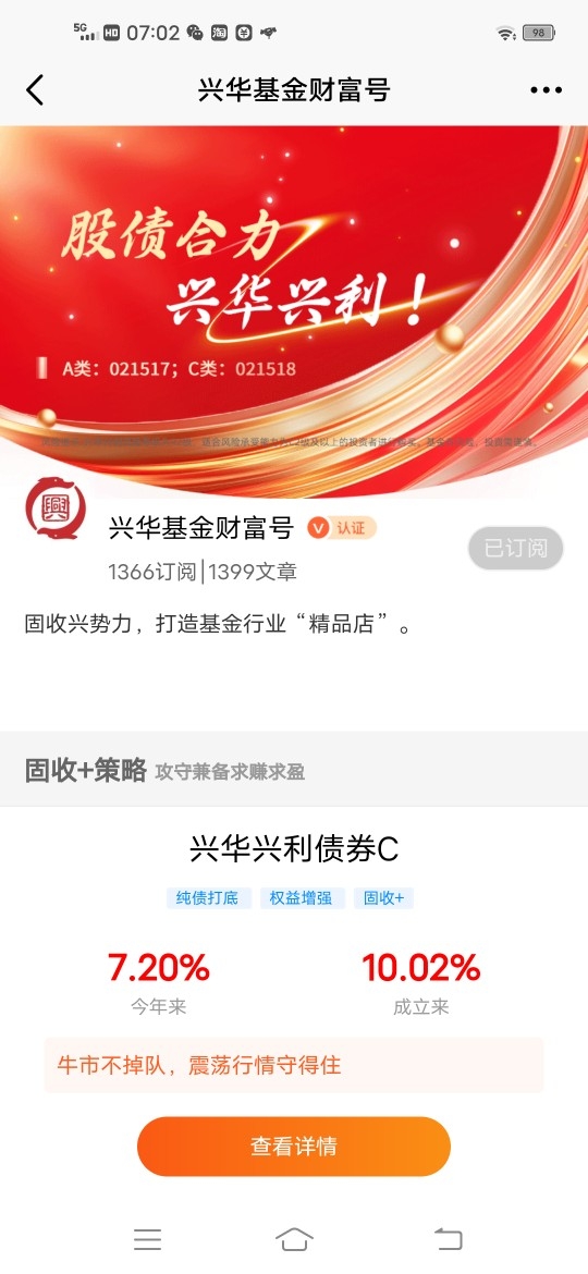 基民小虎是兴华基金的铁粉,无论市场如何震荡一直定投持有$兴华景和混合发起C$ $兴华安裕利率债C$ $兴华安启纯债C$ 等多个基金,收益和体验都非常好!将会继续定投、买入兴华基金产品,并长期坚定持有!@兴华基金