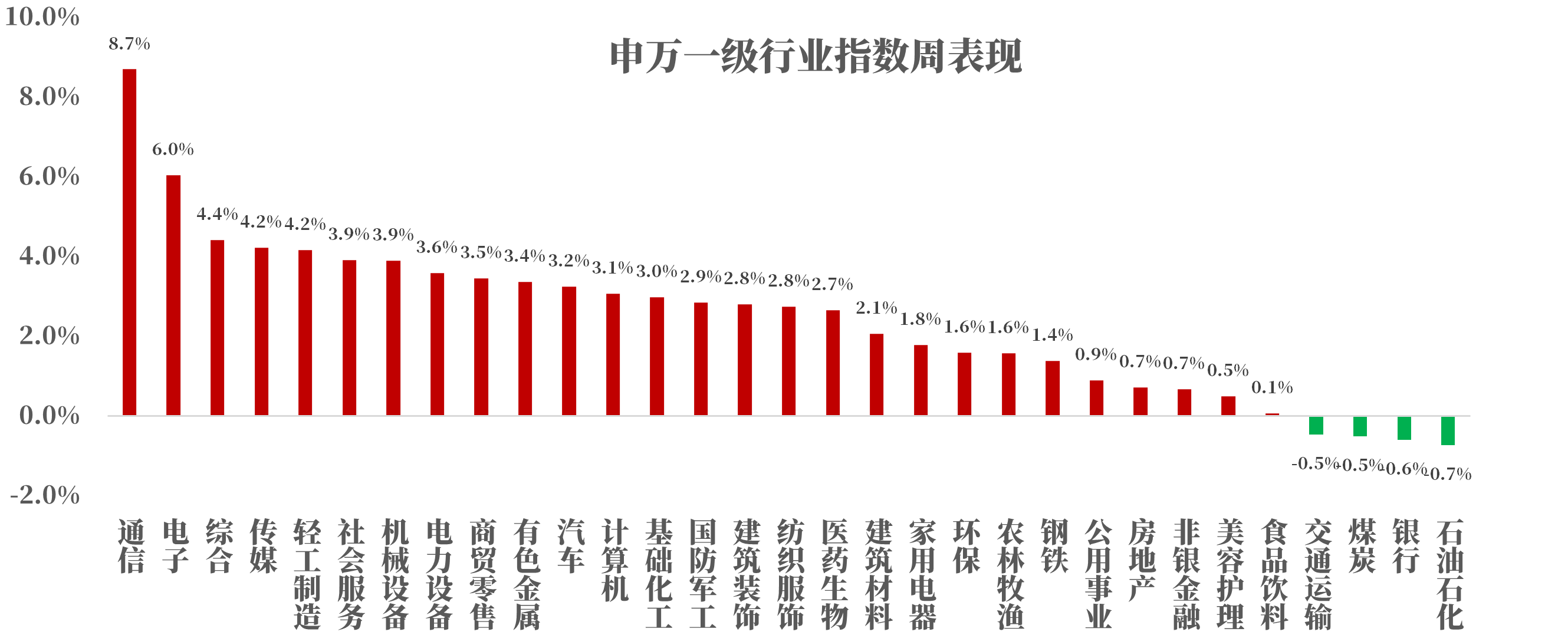 上周行业板块普遍上涨,通信(+8.7%)、电子(+6.0%)板块大幅走强,资金流入显著,石油石化(-0.7%)、银行(-0.6%)等板块小幅下跌。