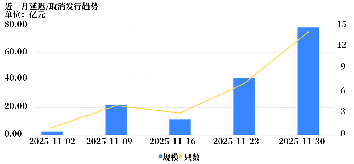 取消发行情况:上周取消发行的债券共14只,累计取消发行78.08亿元,环比有所上升。近一个月共有20只信用债取消发行或者延迟发行,累计取消发行155.38亿元,最新统计如下: