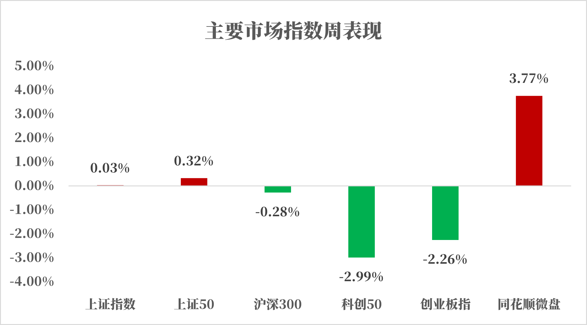上周,A股主要指数表现涨跌互现,大盘指数呈现先抑后扬的态势,上证指数、上证50分别上涨0.03%、0.32%,沪深300小幅下跌0.28%;科创板块表现较弱,创业板指录得2.26%的下跌,而科创50也表现出了2.99%的下跌。而微盘股表现亮眼,走出了3.77%的上涨行情。