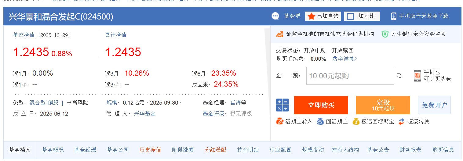 作为一名偏好挖掘潜力成长型基金的投资者,兴华景和混合发起C(024500)自2025年6月成立以来便进入了我的投资视野。经过半年多的持有体验,这只聚焦小微盘价值股的混合型基金,不仅让我收获了可观的投资回报,更让我对"逆向投资+深度研究"的投资逻辑有了更深刻的理解。在此,我想分享一些自己的持基感悟,希望能为其他投资者提供参考。