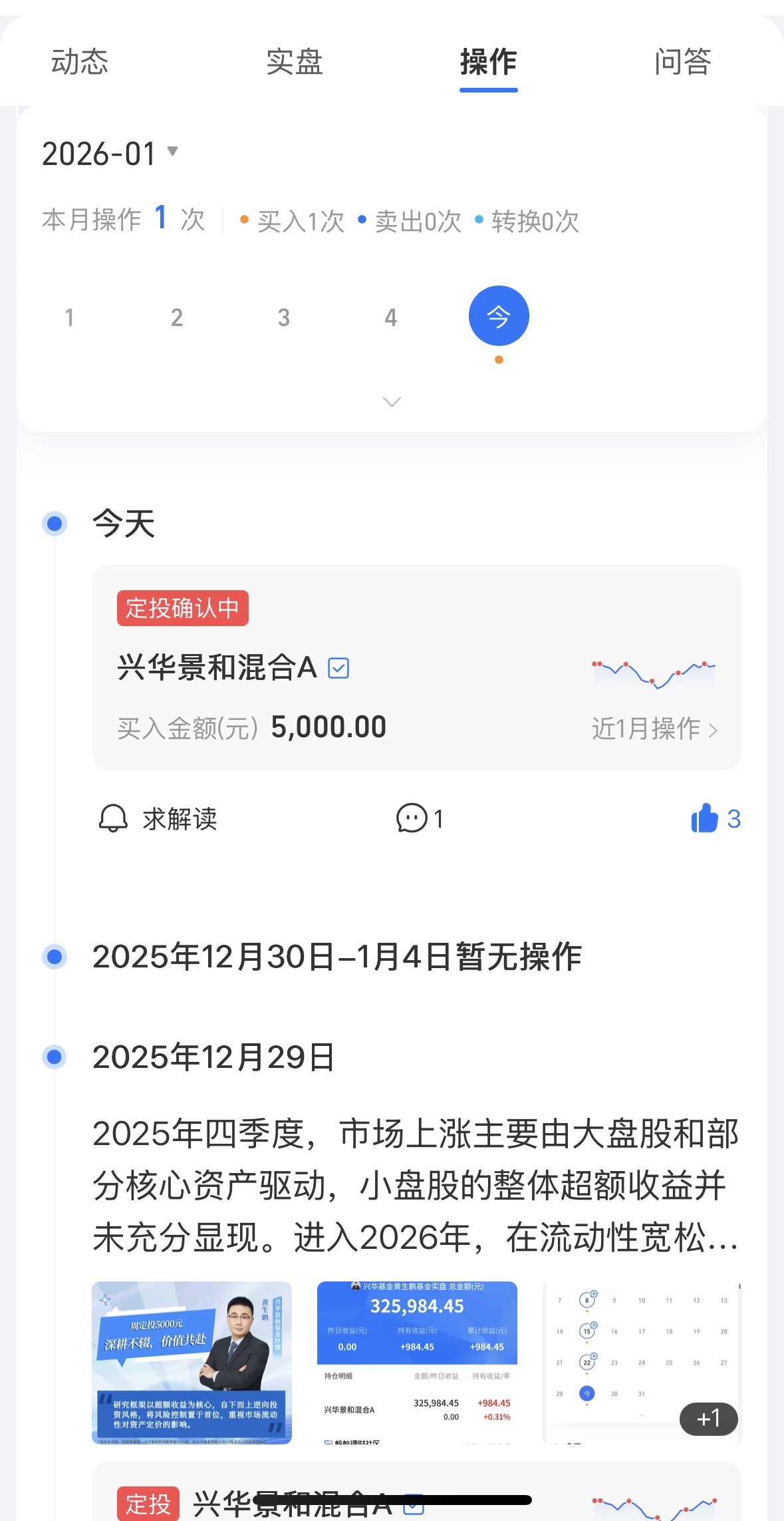 新年的钟声落下,2026年的第一个交易日已然开启,盘中来看小微盘股表现活跃,呈现上涨态势。当市场的声音再次聚拢,当新的预期开始碰撞,我想首先告诉你们:我依然坚持周定投兴华景和A5000元$兴华景和混合发起A(OTCFUND|024499)$,与各位同在。正如我之前文章中所提到的:展望2026年一季度,A股市场有望在流动性持续宽松的推动下,行情向纵深发展,市场风格或将从前期的大盘占优转向更为均衡,为小盘股带来更多表现机会。