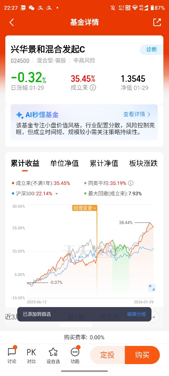 首先聊聊我的持基心得,选对一只适配市场节奏、风格清晰的基金,远比盲目追热点更重要。当初选择兴华景和混合发起C,并非偶然,而是经过多维度筛选后的决定。这只2025年6月成立的新基金,短短半年多时间就交出了成立以来24.35%的涨幅答卷,我持有至今也斩获了8%+的收益,在去年市场反复震荡的行情里,这样的表现足以称得上亮眼。而这份成绩的背后,正是我最认可的两大核心优势,也是我坚定持有的底气。其一,精准的持仓布局,基金聚焦小市值价值型标的,重点深耕高端制造、工业机械领域,还精准挖掘“专精特新”优质企业,2025年小市值价值股和高端制造板块本就是景气赛道,基金踩准了行业红利,不偏科、不追高,专注细分领域的核心成长,这种清晰的投资方向,让我不用担心里程碑式调仓带来的波动风险。其二,双基金经理的专业护航,崔涛和黄生鹏两位经理各司其职、强强联合,崔涛经理兼具风控与跨领域管理经验,能精准把握市场节奏;黄生鹏经理深耕产业研究与风险管理,擅长挖掘优质标的,双经理配置既保证了选股的精准度,又守住了风险底线,让普通投资者能安心托付。