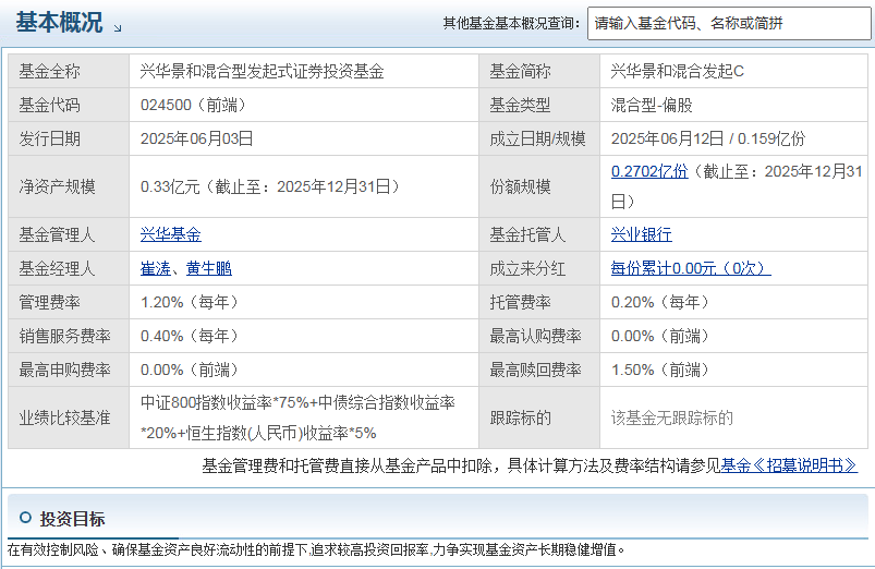 兴华景和混合发起C(024500) 作为一只混合型发起式基金,结合其投资策略、产品设计及运作特点,核心优势主要体现在以下5点,兼顾收益潜力与风险控制,适配长期投资需求: