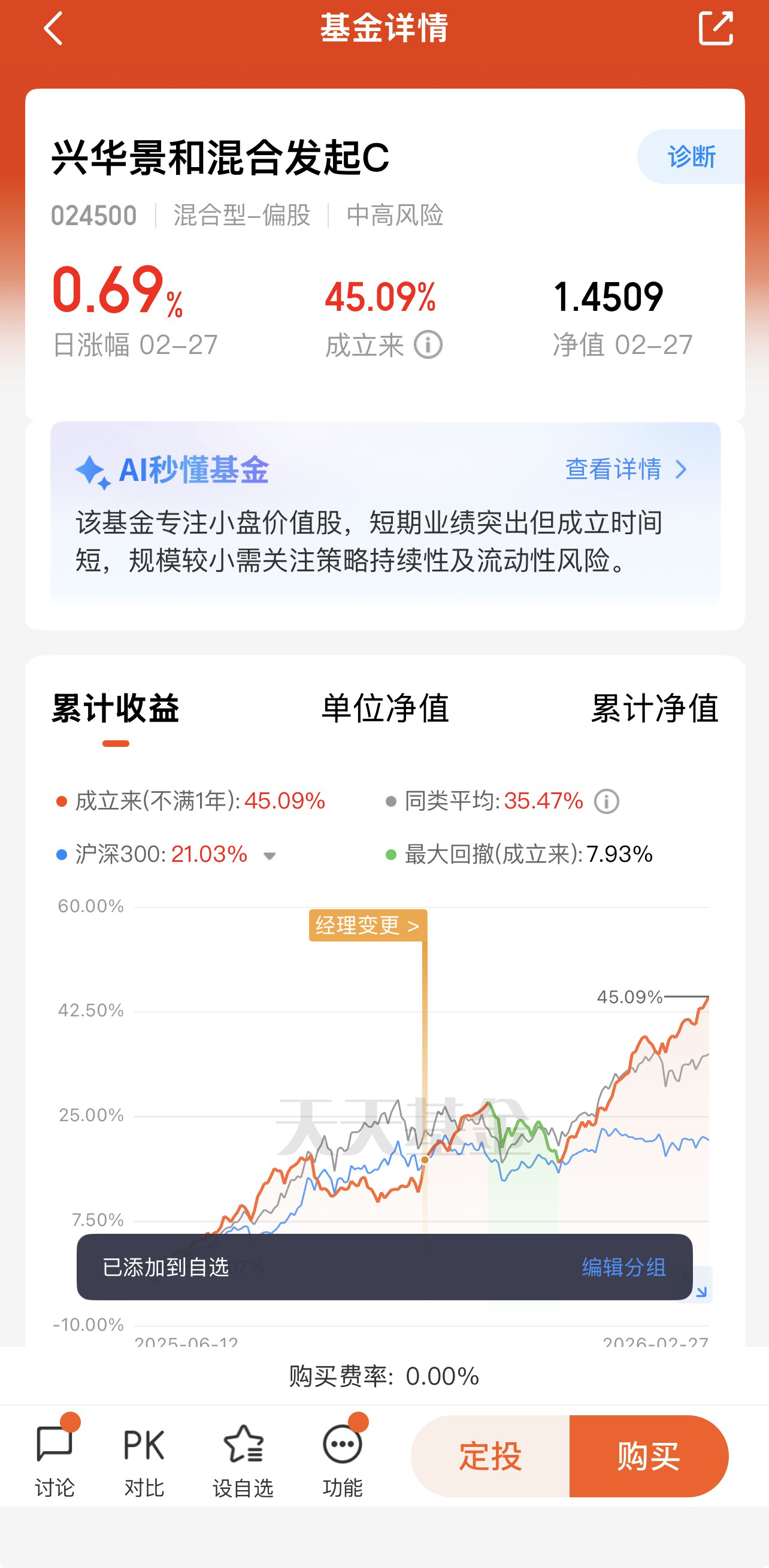 骑牛看熊比较看好兴华景和混合发起C(024500) 投资体验如下: