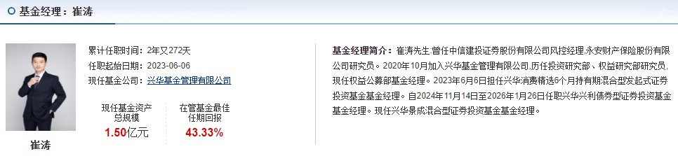 基金业绩的核心是基金经理的管理能力,这只基金由崔涛、黄生鹏两位专业人士共同管理,从业背景互补、投研经验丰富。崔涛先生早年任职中信建投证券风控经理、永安财险研究员,风控意识与产业研究功底扎实,2020年加入兴华基金后,从研究员成长为基金经理,对小微盘赛道研究透彻。