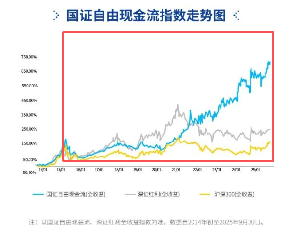从收益上看,和市面上主流的宽基相比,这基跟踪的指数自2014年至2025年9月底,指数累计涨幅高达698%,年化收益率20%,远跑赢主流宽基、红利指数及同类现金流策略指数。