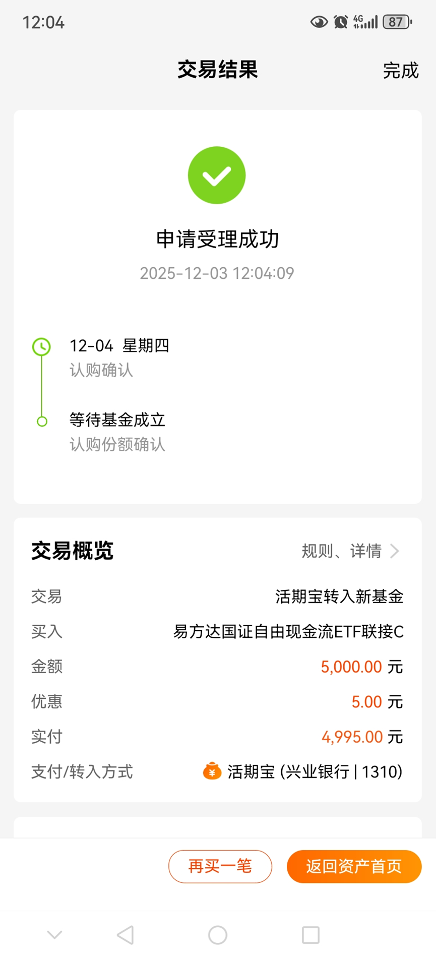 今天我先买入5000元易方达国证自由现金流ETF联接C(024567),之所以选择这只基金,主要是因为,易方达作为公募一哥,指数基金产品全面,费率够低。
