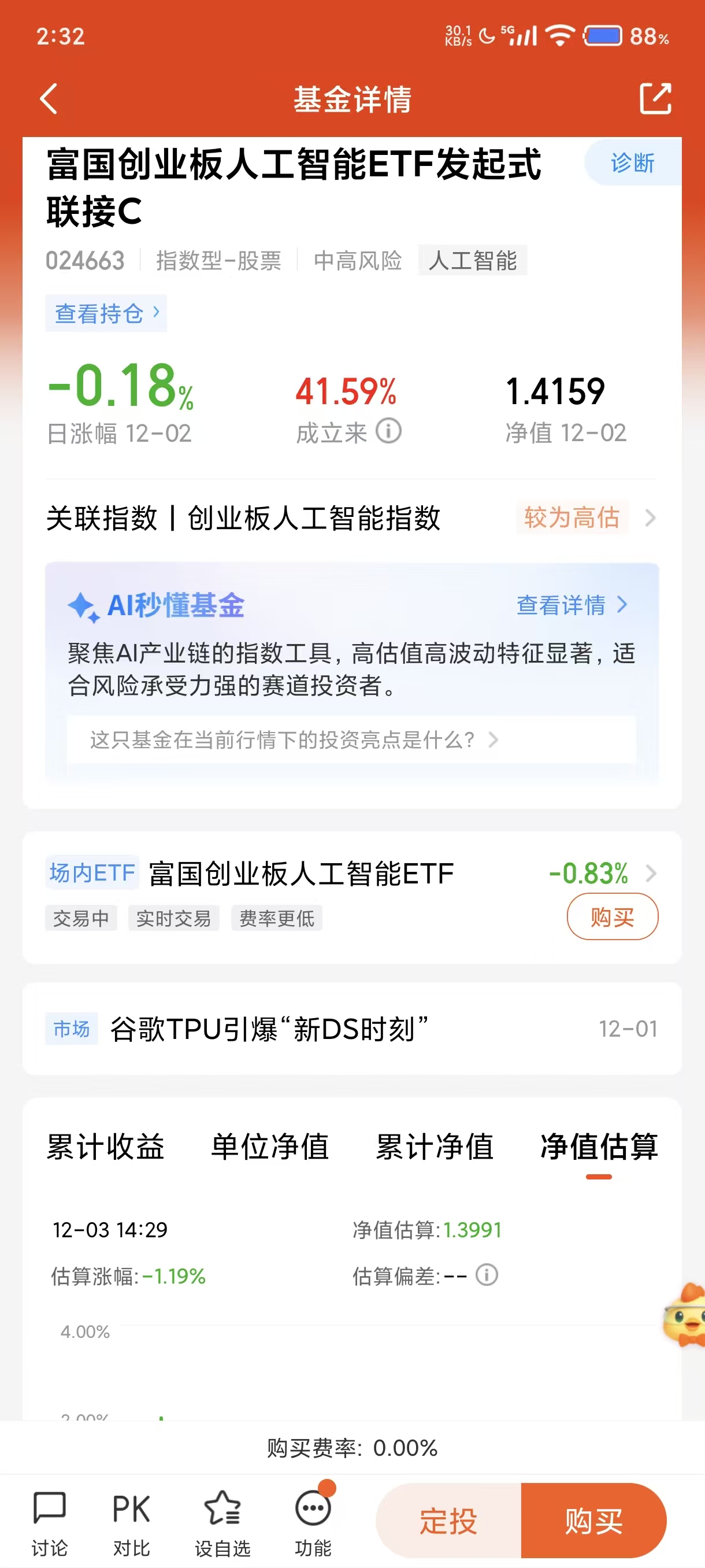 今天AI科技股开始震荡回调,主要是年底市场风格偏向保守。富国创业板人工智能ETF发起式联接C(024663)跟踪的是创业板人工智能指数,包括创业板中与人工智能技术研发、应用密切相关的上市公司,前十大重仓股包括中际旭创、新易盛、天孚通等。$富国创业板人工智能ETF发起式联接C(OTCFUND|024663)$