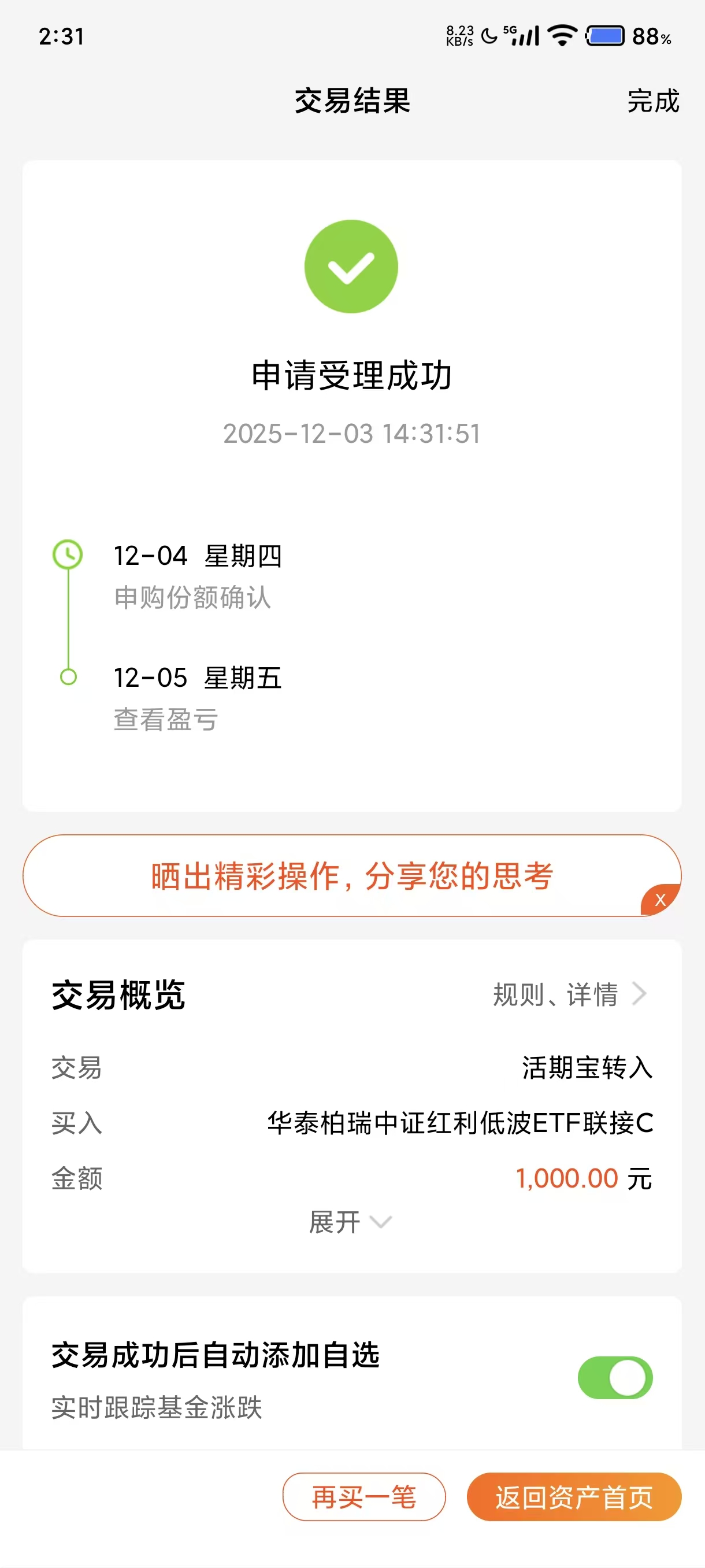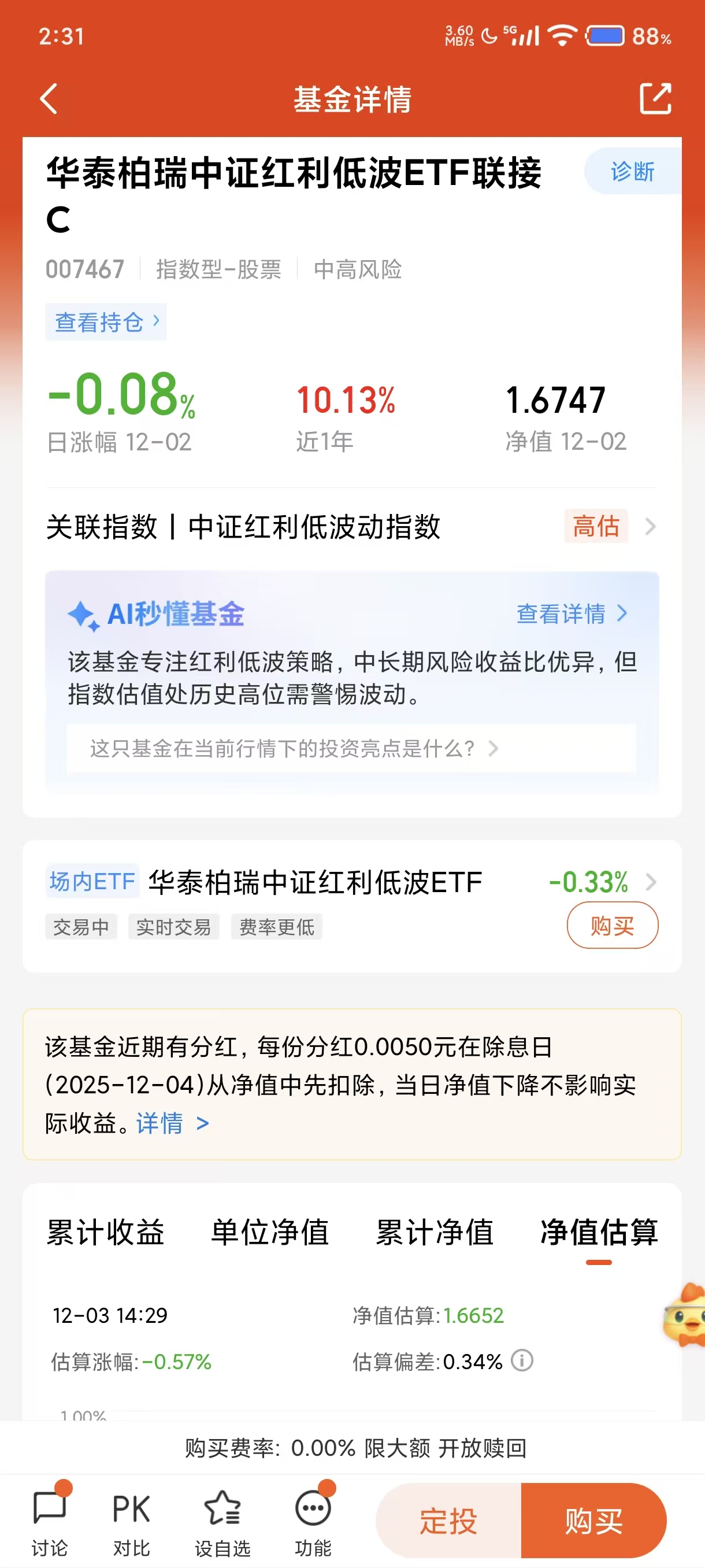 我今天选择加仓1000元华泰柏瑞中证红利低波ETF联接基金C(007467),跟踪的是中证红利低波指数,选取的是现金股息率高、分红稳定的上市公司,高股息率特性使得它在市场下跌时吸引避险资金流入,而且基金本周已经连续27个月分红了,总之这只基金不仅回撤小,赚钱效应好,还有分红,我会持续加厚仓位,长期看好它的表现。$华泰柏瑞中证红利低波ETF联接C(OTCFUND|007467)$
