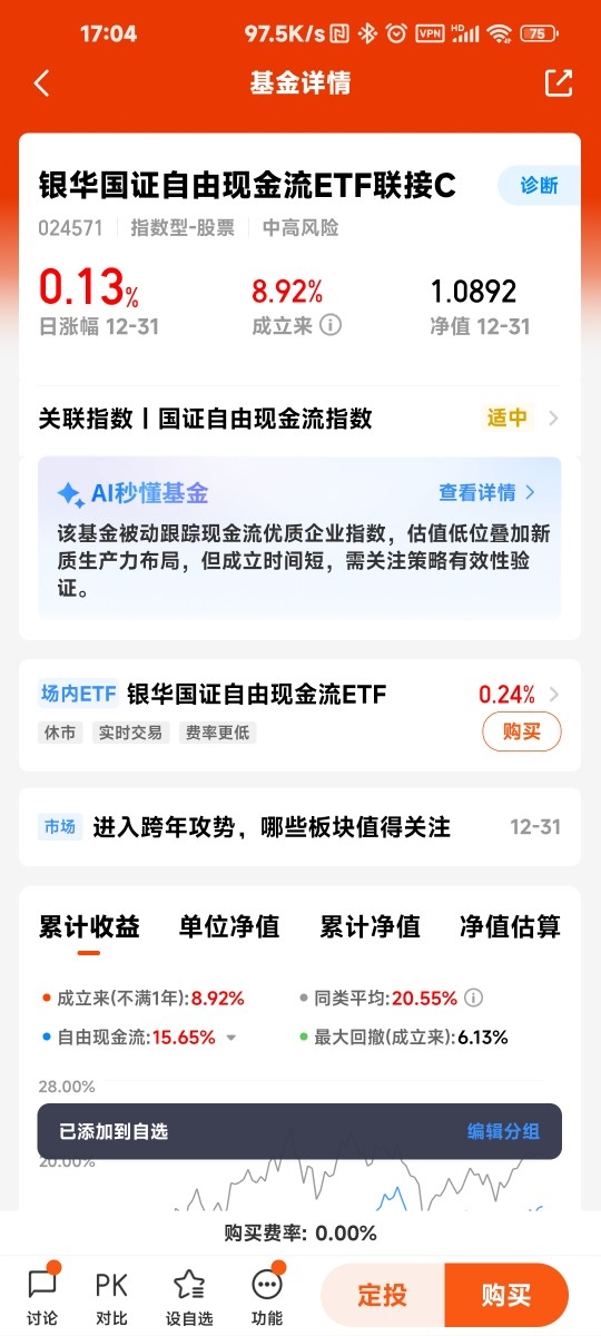 我现在主要拿着银华国证自由现金流ETF联接C,说说真实持有体验。这个基金选的是现金流好的公司,不是看故事、画大饼那种,更多是已经能稳定赚钱、账上有真金白银的企业。行情好的时候,它不算最猛的;但行情一差,回撤相对小,心态会稳很多。