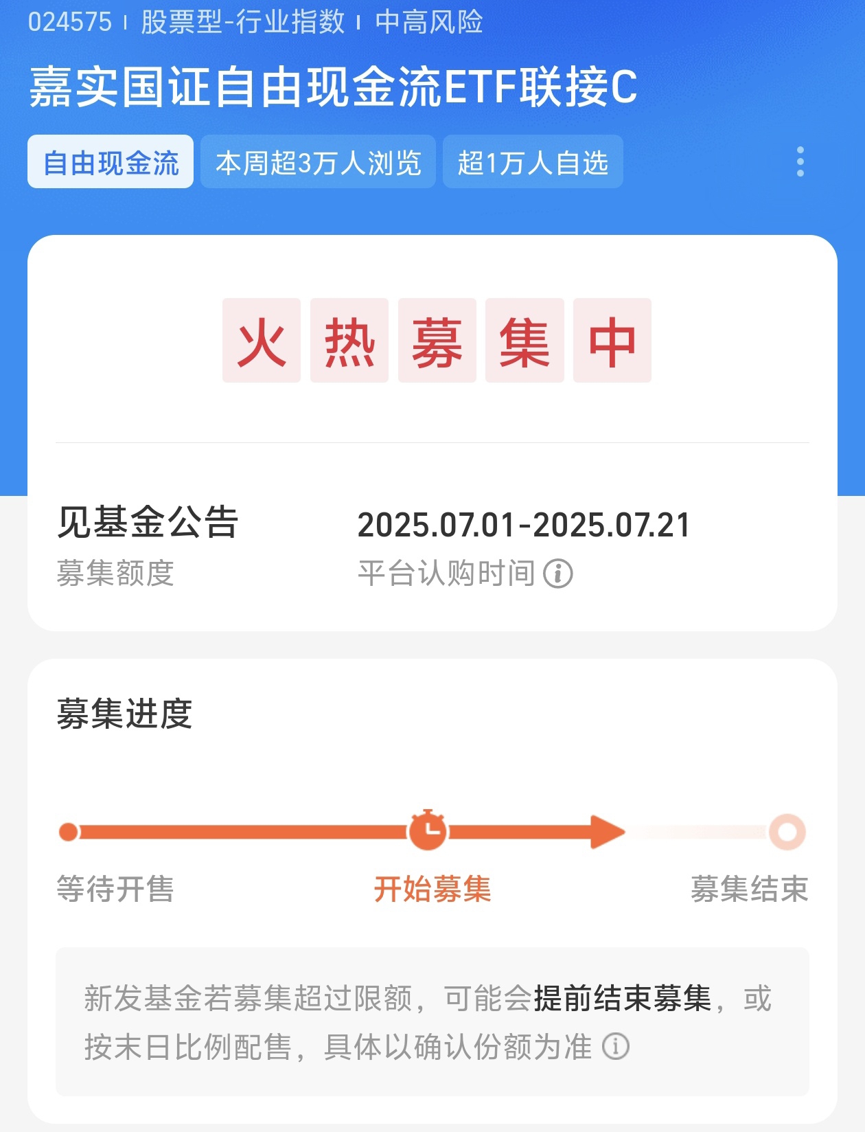 $嘉实国证自由现金流ETF联接C$ 是一个新发基金,目前单位净值低,配置价值高。目前也在火热的募集中,投资灵活,买入零费率。基金经理也是非常的优秀,从业年均回报收益率高达17.81%,赚钱能力强呀!基金选取A股自由现金流率从高到低,前100只证券作为指数样本。自由现金流充足的企业可以通过战略聚焦+效率革命,构建企业护城河。基金每个季度也会进行分红,跟踪指数已连续上涨6年。我也是非常的放心,期待后期收益。