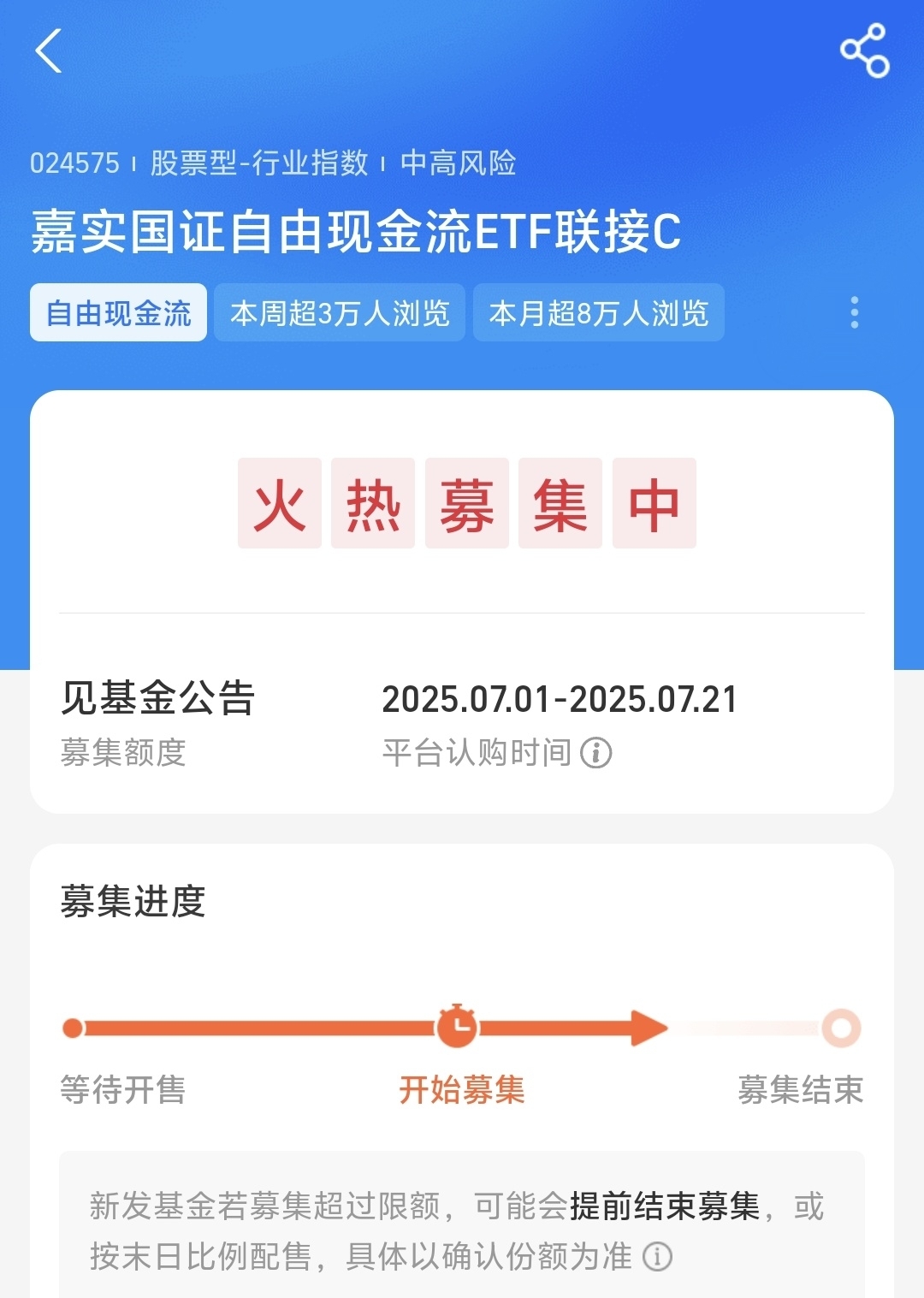 我一直挺瞅好$嘉实国证自由现金流ETF联接C$基金的,这基金募集马上就结束了,今