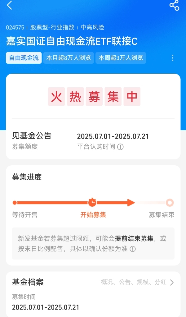 今天全市场上涨个股有2078家,下跌个股有3088家,36只股涨停。两市半日合计成交10150亿。再次行情下我准备入手新方向!$嘉实国证自由现金流ETF联接C$ 的募集期即将结束,这款产品一直是我重点关注的对象。它所跟踪的指数表现相当亮眼,累计涨幅已达117%,近半年也收获了15个点的增长,成长势头十分稳健。再看基金经理,过往业绩同样可圈可点,年均回报率达到14.92%,在同类基金中处于上游水平。目前该基金仍处于募集阶段,综合其跟踪指数的潜力和基金经理的管理能力,我非常看好它未来的表现,相信能带来不错的收益。