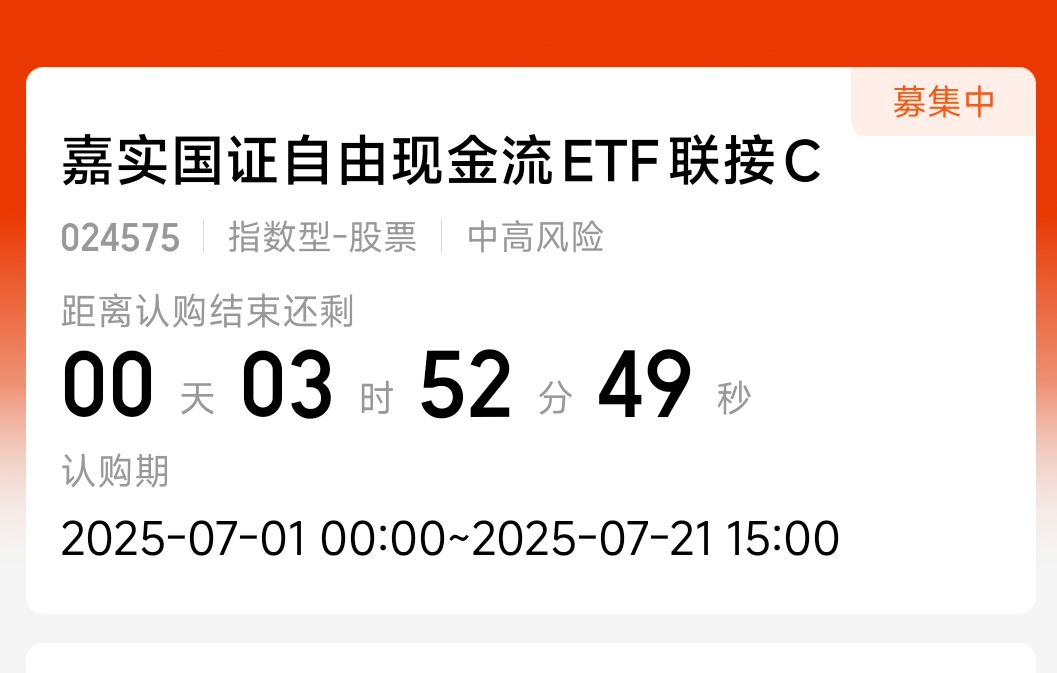 今天这个$$嘉实国证自由现金流ETF联接C$ 最后一个募集的期间了,现金流不仅有季度的分红高股息还有稳定收益,盈利能力比较强呢,据说该指数已经连续6年连续正收益了呢,今天也是最后一天在募集呢,等待后面募集成功来一波收益吧,比红利还要稳定呢!现在还是比较低估的这个方面的现金流!长期看一波!$东财沪深300A$ $华夏科创50指数增强C$
