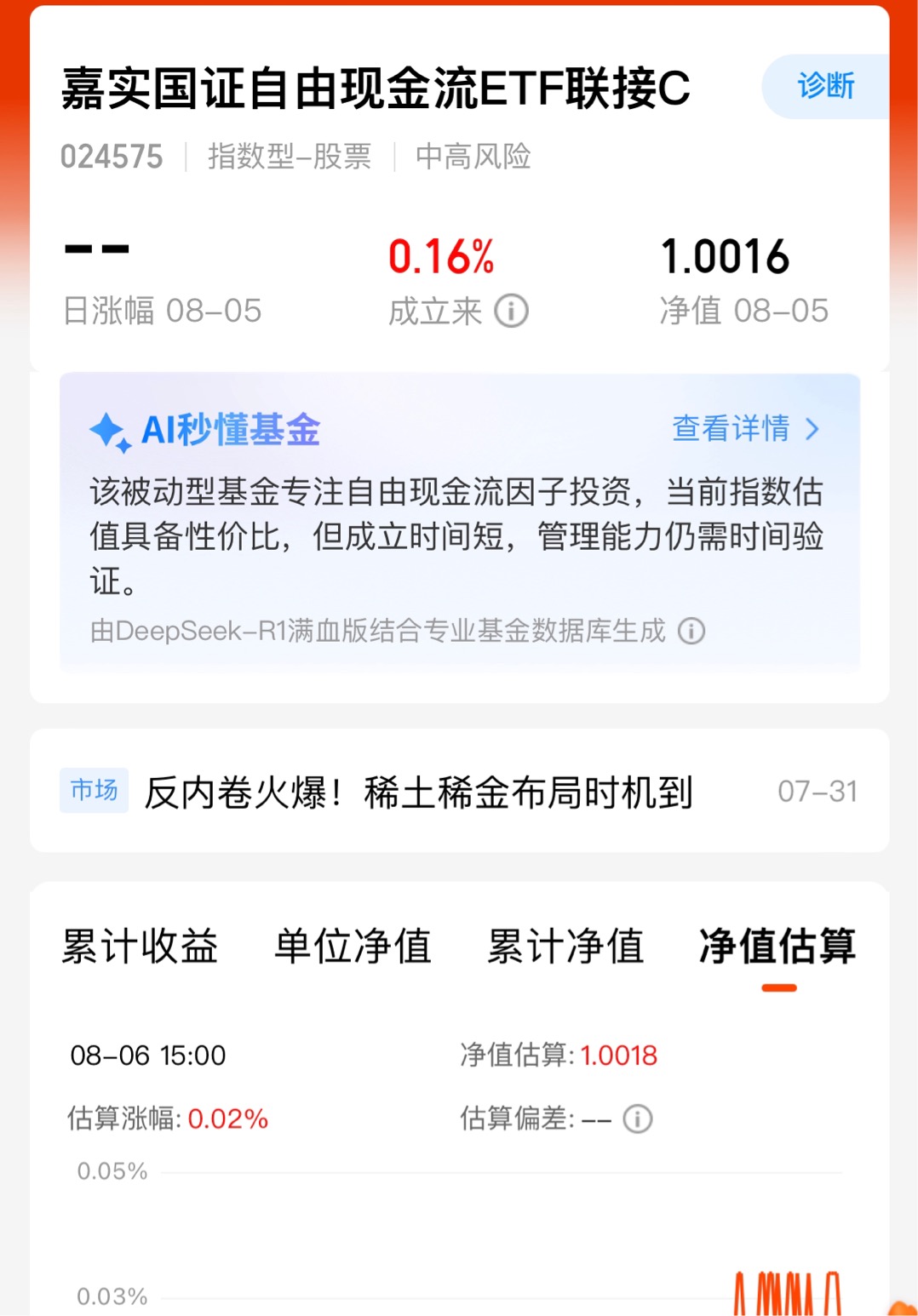 现金流还是挺稳定的,早在美国就比较成熟被作为保险底仓去布局。近期股市在震荡中修复,跌宕起伏还是挺考验心态的。现金流板块反映的是企业真实的账单流水,也是企业健康的照妖镜,它主要投资高股息领域,最近我关注的$嘉实国证自由现金流ETF联接C$ ,成立14天了,涨幅0.16%,风险较低,收益稳定。当前估值还在低位,指数底层涨幅也是远远跑赢沪深300,挺优秀的。后面还有上涨空间!