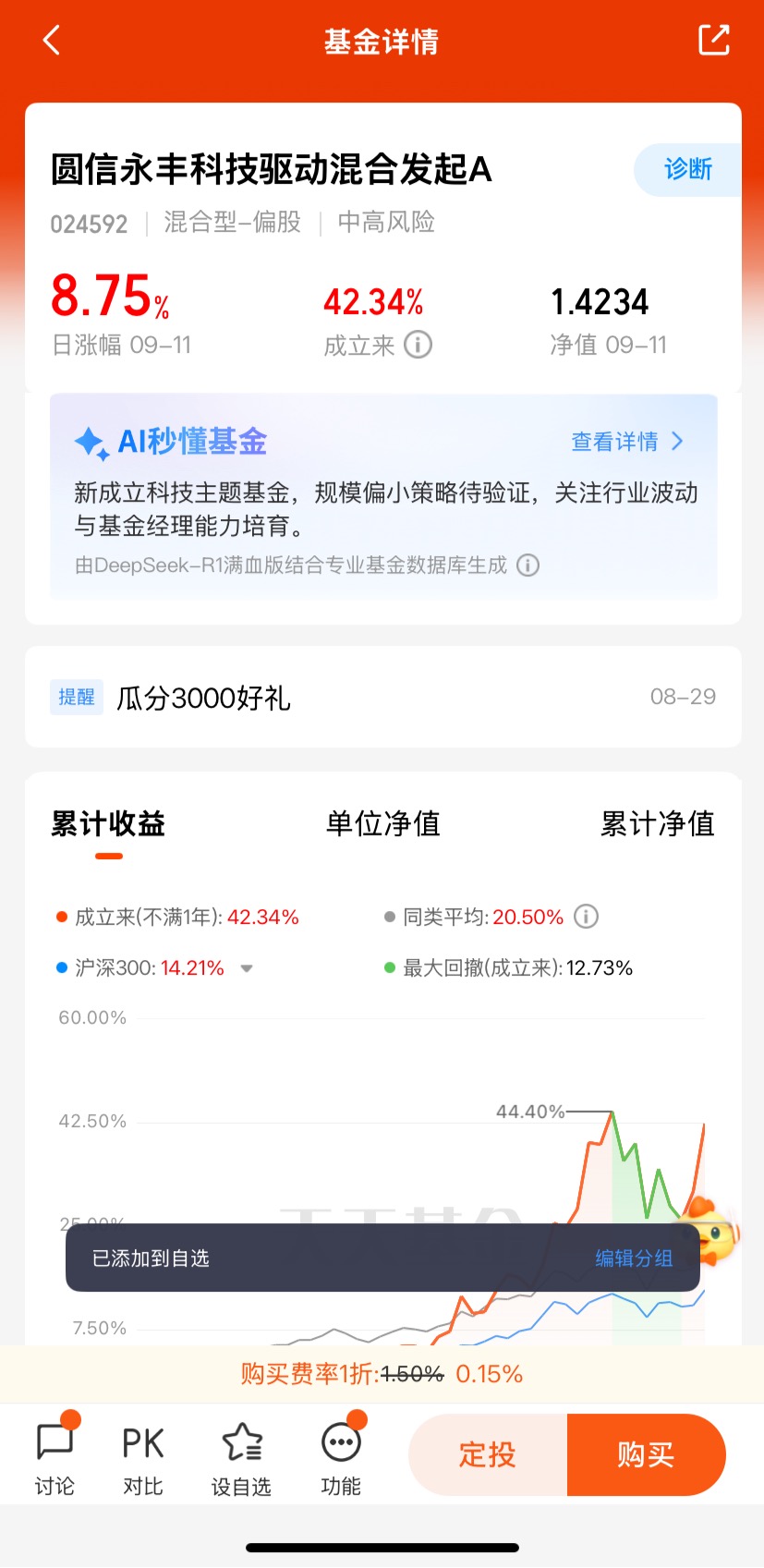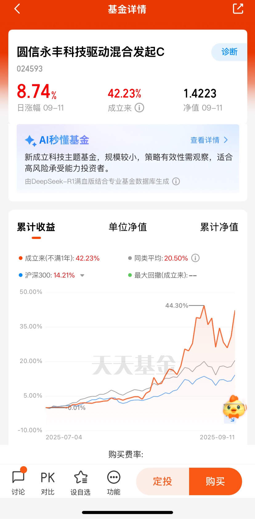 截至2025年9月11日,基金净值达1.4234,近1个月涨幅超33%,显著跑赢同期科技指数。规模适中,调仓灵活,在震荡市中可快速捕捉细分轮动机会。