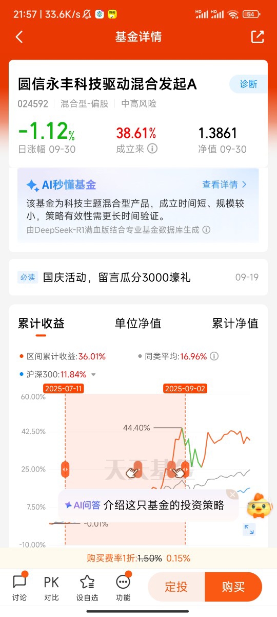 结合见闻与基金特性,今年剩下的三个月我制定了清晰规划。首先是“坚定核心持仓”,继续持有圆信永丰科技驱动混合A。政策端科技部等七部门发文支持科技金融,产业端海外云厂资本开支上调、国产算力产能爬升,这些都让AI与半导体赛道的长期逻辑更扎实,基金80%资产投向科技主题的布局,正好能精准捕捉这类机会。