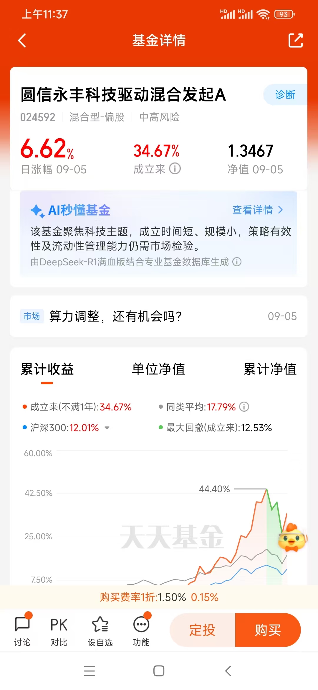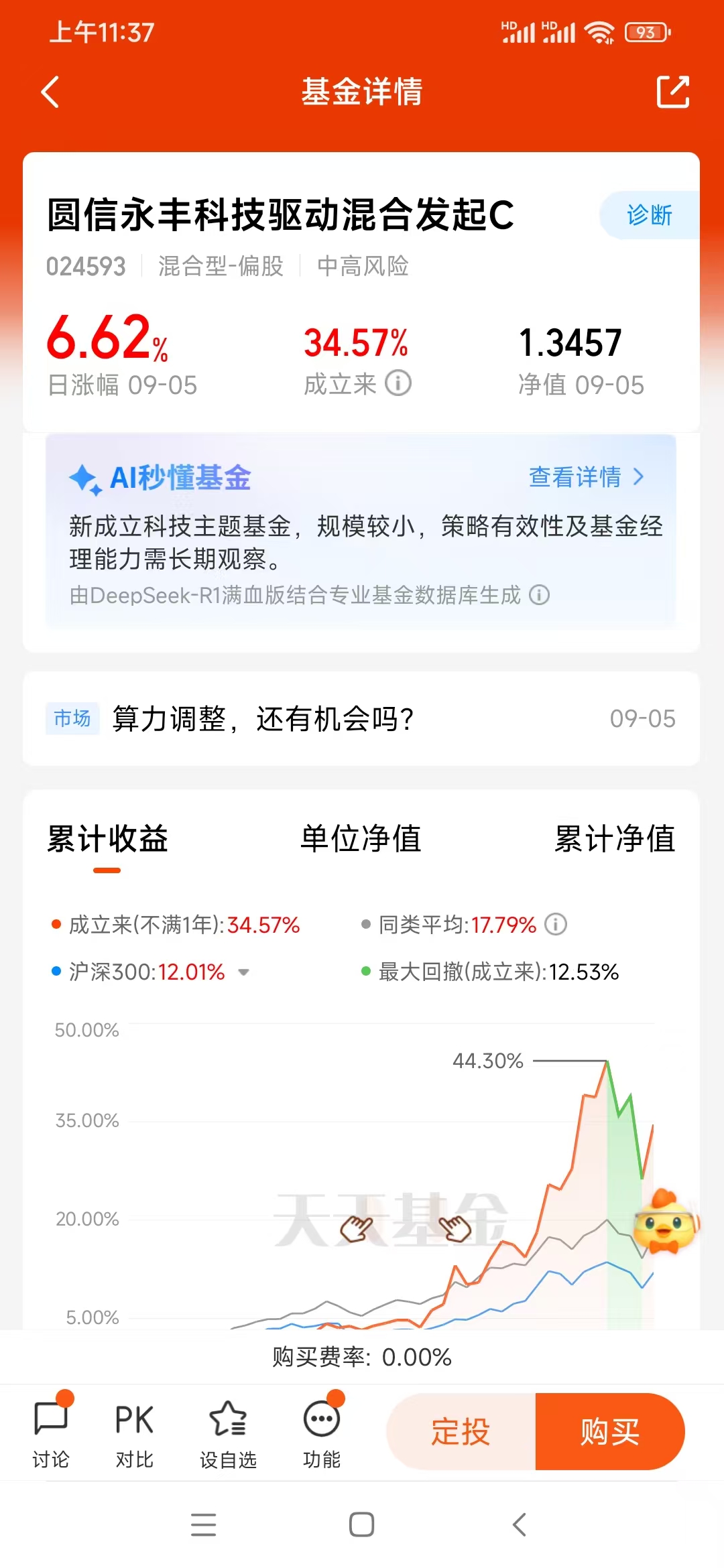 上班族没精力盯盘、研究个股,买基金最适合。对比一圈后我选了圆信永丰科技驱动混合发起C(024593),就三个原因: