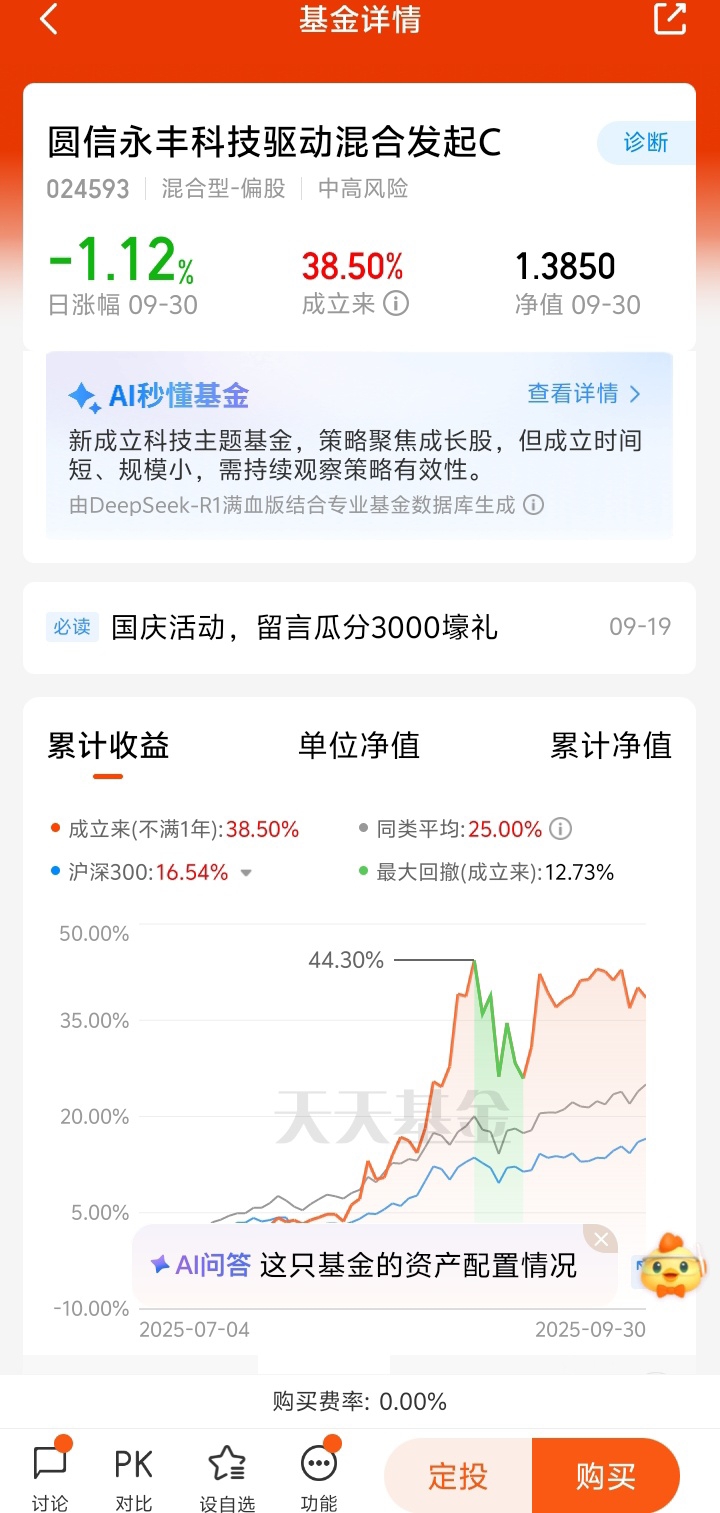 在剩下的时间里,我将密切关注科技板块的动态,特别是AI应用、半导体、人形机器人等细分领域的发展。同时,我也会根据市场变化和个人风险承受能力,适时调整投资组合,确保资产的稳健增值。投资是一场马拉松,而非短跑,我将保持理性与耐心,期待在科技浪潮中收获满意的回报。@圆信永丰基金 $圆信永丰科技驱动混合发起C$