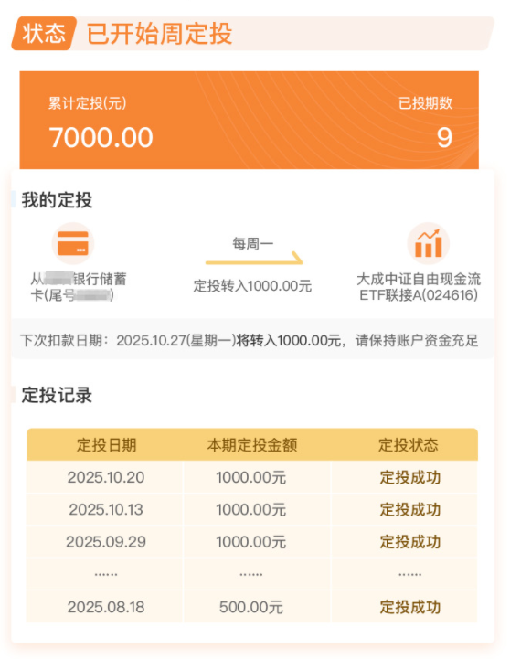 相关基金:$大成中证全指自由现金流ETF发起式联接A(OTCFUND|024616)$ $大成中证全指自由现金流ETF发起式联接C(OTCFUND|024617)$ $大成中证红利指数A(OTCFUND|090010)$ $大成中证红利指数E(OTCFUND|022169)$ $大成中证A50ETF联接A(OTCFUND|021212)$ $大成中证A50ETF联接E(OTCFUND|021359)$