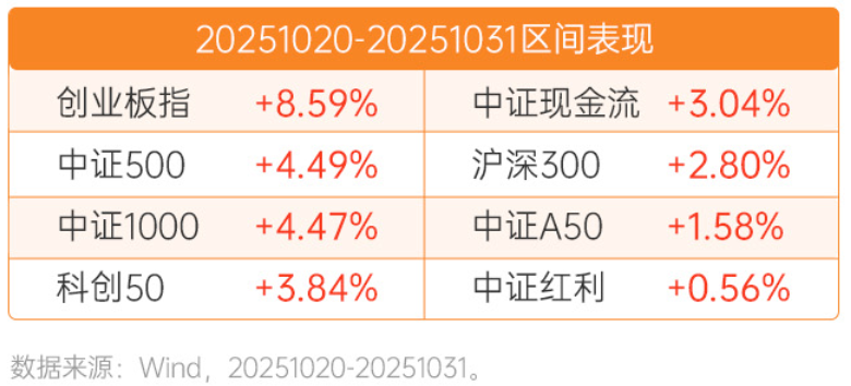 向后看,宏观层面,经济数据延续边际放缓态势,内生动能尚待提振。不过,中美双方就关税问题达成一定共识,短期再起摩擦的风险降低,对市场干扰将会减弱。企业盈利角度,三季报披露完成,全A盈利保持正增长;板块上,TMT业绩增长加速,金融也显著好转;行业上,利润体量较大、ROE改善、利润保持增长的是有色和非银;电子、机械设备、电力设备、化工等盈利能力也出现修复。盈利周期底部的夯实为后续多领域行情扩散奠定基础。政策上,四中全会后进入 “空窗期”,年底前关注中央经济工作会议。海外方面,美联储降息25bp,但鲍威尔讲话偏鹰,增加美元和美债利率走强的概率,不利于非美资产表现。综上,短期市场缺乏催化剂,或将继续保持震荡。不过,无风险收益下行,股市机会成本降低,国内中长期资产重估的进程不变。