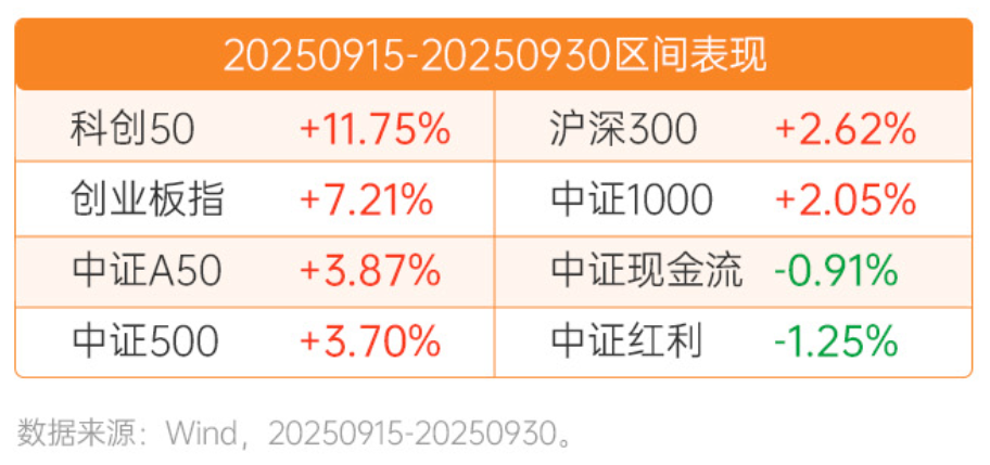 九月下半月,市场处于震荡后的整固阶段。其实,月初的调整幅度本就不大,虽然拥挤度压力得到一定程度的缓解,但分歧仍在累加。结构上,科技成长依然是下半月的主线,但赛道内的强势细分有所切换,如AI链中光通信、光模块保持震荡,但芯片却大幅上涨。受益于“反内卷”政策和大宗商品价格上涨,电池、有色金属紧随其后,都有不俗的表现。国庆假期,全球市场权益资产普遍上涨,给国内带来补涨空间,同时情绪传导下也有利于维持A股投资者的风险偏好。