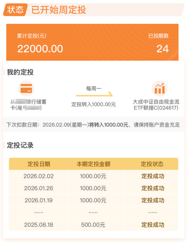 相关基金:$大成中证全指自由现金流ETF发起式联接A(OTCFUND|024616)$ $大成中证全指自由现金流ETF发起式联接C(OTCFUND|024617)$ $大成中证红利指数C(OTCFUND|007801)$ $大成中证红利指数E(OTCFUND|022169)$ $大成中证红利指数A(OTCFUND|090010)$ $大成中证1000指数增强发起式A(OTCFUND|018661)$ $大成中证1000指数增强发起式C(OTCFUND|018662)$ $大成中证500指数增强A(OTCFUND|021170)$ $大成中证500指数增强C(OTCFUND|021171)$