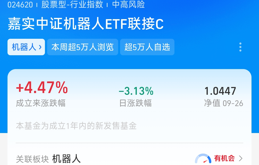 今天大盘走势还是比较乐观,科技板块也是迎来回暖,上周五不确定的因素较多,叠加一些资金过节出逃,今天是本月倒数的第二天,行情向好,这个$嘉实中证机器人ETF发起联接C$ 机器人的方向估值也是上涨的,来上车一波!成立以来涨了4.47%,从机器人的行业来看,当前机器人产业处于技术突破与应用拓展双轮驱动期,工业协作机器人、医疗康复机器人等领域应用加速渗透,叠加人工智能与机器人技术的深度融合,为板块提供长期增长逻辑。加上板块资金交易比较活跃,还有政策的支持下,市场现在有所改善,当前我还是比较看好这个机器人的方向的,期待后续继续上涨吧,