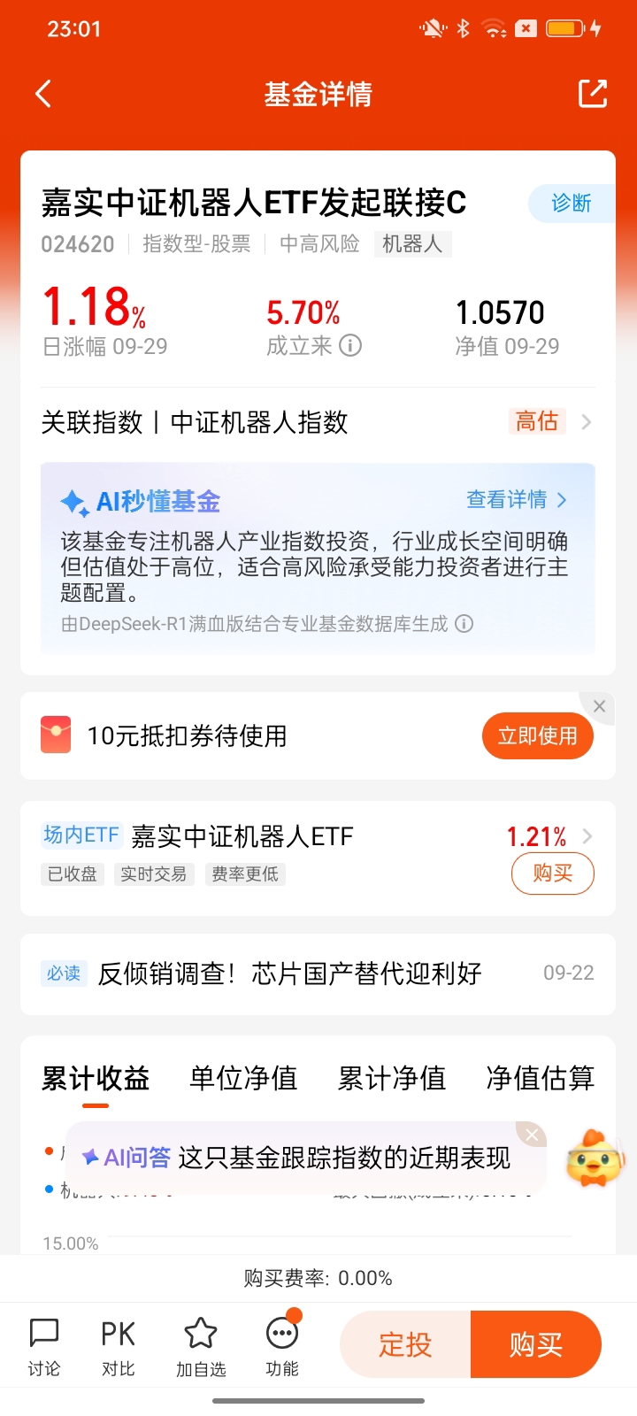 国内优必选再来千万级订单!日前优必选子公司正式签订采购合同,天奇股份将采购总价3000万元的优必选工业人形机器人,加上本次订单,优必选Walker系列人形机器人已获得近4.3亿元合同。机器人面前市场需求量越来越高,国产机器人技术也在不断更新迭代。嘉实机器人作为一只新成立不久的基金表现良好,正处于业绩成长期,近一个月涨幅5.42%%表现不错,今日涨幅1.18%还是很不错的,作为一直新成立的基金也表现出了该有的竞争力,现在机器人市场需求量大,未来可期,是上车的好时机。