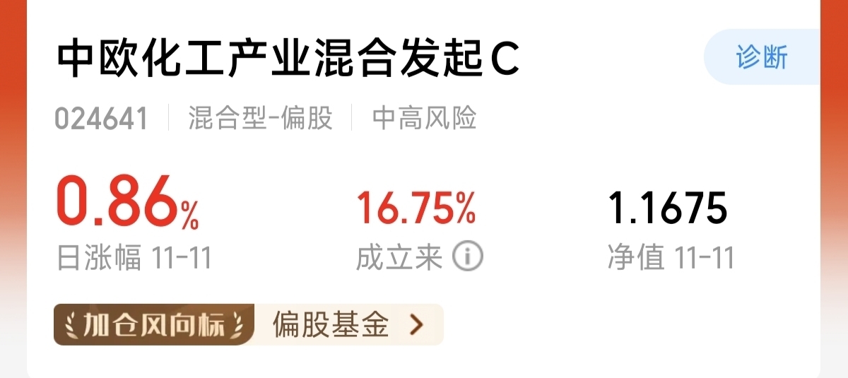 今天市场迎来集体调整。包括昨天上涨的化工指数也是出现回落。但是今天惊现一只涨的化工,$中欧化工产业混合发起C$ 竟然涨了0.86%。现在科技来回波动,还是得再配点化工对冲下。我看了,这是全市场唯一一只化工主动基,讨论区还有15元红包,我准备先上车了