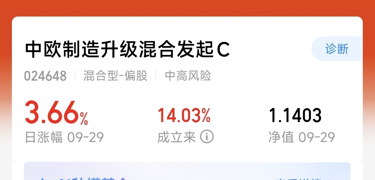 机器人今年来一直走的是主线行情。$中欧制造升级混合发起C$ 这是主动的科技基金。聚焦人机器人产业链,今天大涨了3.66%。同类主动机器人基金涨幅全市场第一。同期同类长期做到了优秀。而且整体做到了涨多跌少。