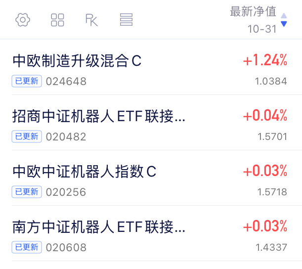 今天股市指数虽然集体收跌,但是板块个股涨多跌少,大科技相关分化明显,尤其是机器人方向,今晚的$中欧制造升级混合发起C(OTCFUND|024648)$更新收涨+1.24%,其持仓聚焦人形机器人,弹性足冲劲强,后市可期啦!