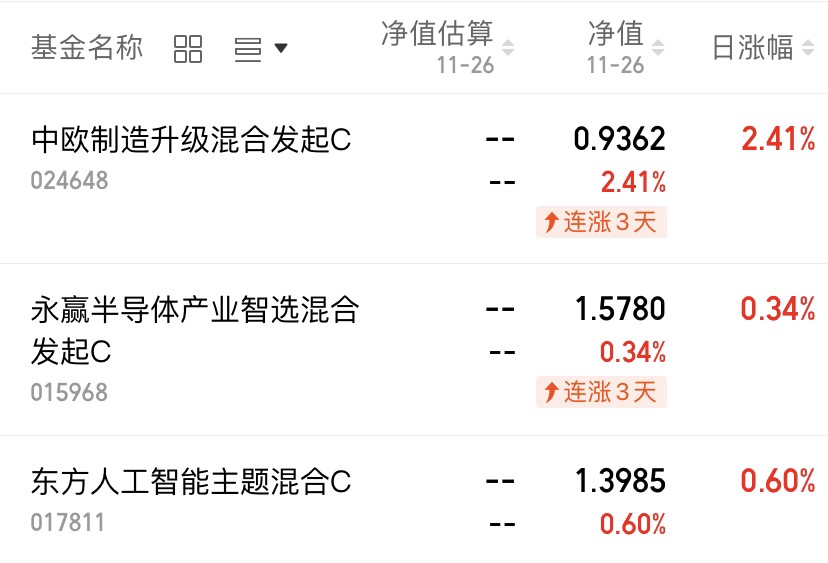 今天的行情还是大科技带动上涨,只不过是抱团资金形成的上涨效应,科技类存在着一定的分化。$中欧制造升级混合发起C(OTCFUND|024648)$今天上涨2.41%,看着确实很诱人,$永赢半导体产业智选混合发起C(OTCFUND|015968)$上涨0.34%,$东方人工智能主题混合C(OTCFUND|017811)$上涨0.6%。