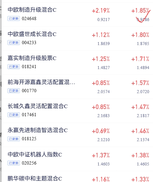 $中欧制造升级混合发起C$ 今日涨幅1.85%。主动的机器人基金。业绩长期做到了优秀。