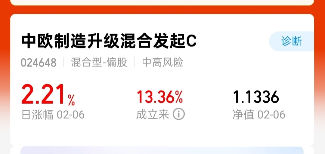 中欧制造升级混合C,涨2.21%,逆势大涨不错呀。该基金聚焦制造业升级领域,持仓以制造业为主,覆盖汽车零部件、机器人、智能装备等细分行业,适合中长期持有。