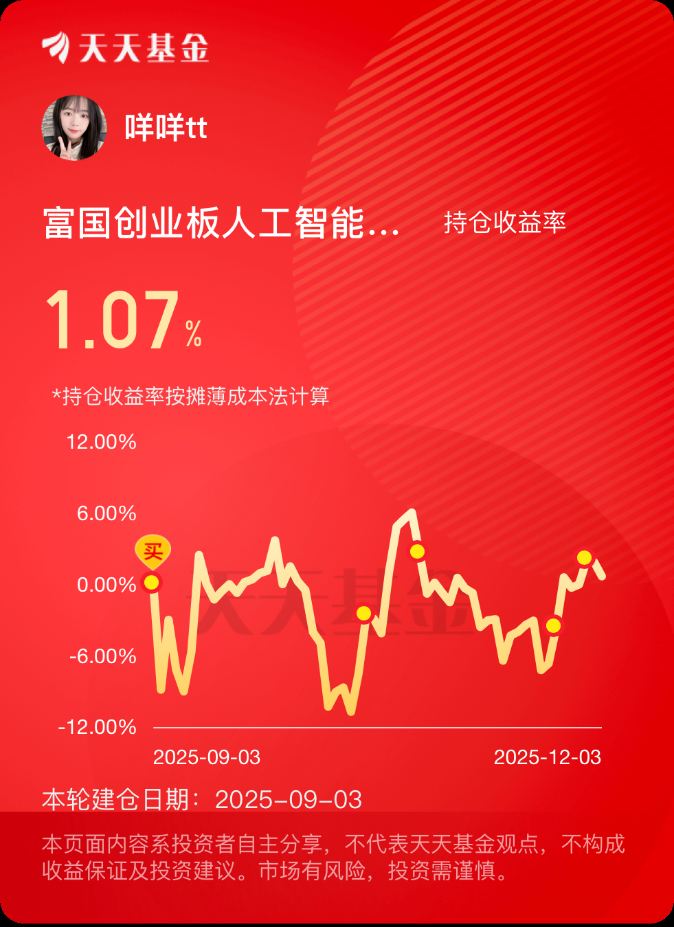 我持有的 $富国创业板人工智能ETF发起式联接C(OTCFUND|024663)$所跟踪的创业板人工智能指数恰好也是CPO光模块含量最高的AI指数,光是今年就涨了85%+,近期表现也还不错,咩咩已经开始吃上肉了,小赚1个多点。