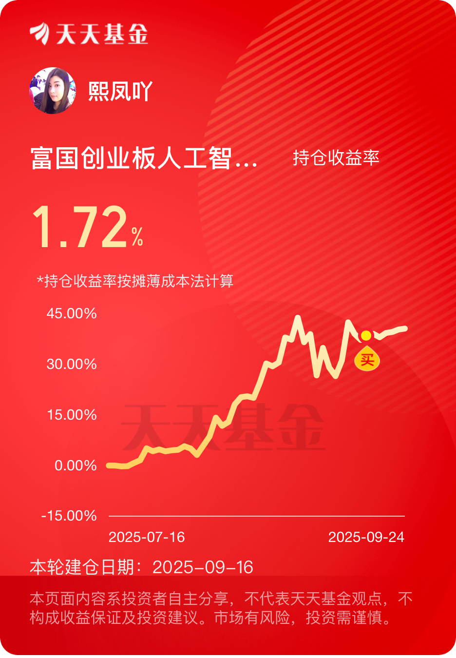 熙凤在9.16号的时候建仓了$富国创业板人工智能ETF发起式联接C$,今天看了下