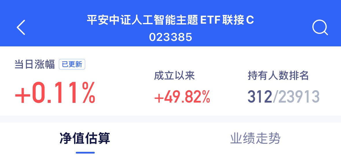 $平安中证人工智能主题ETF联接C$今天逆市上涨0.11%,成立以来上涨49.82%,优秀