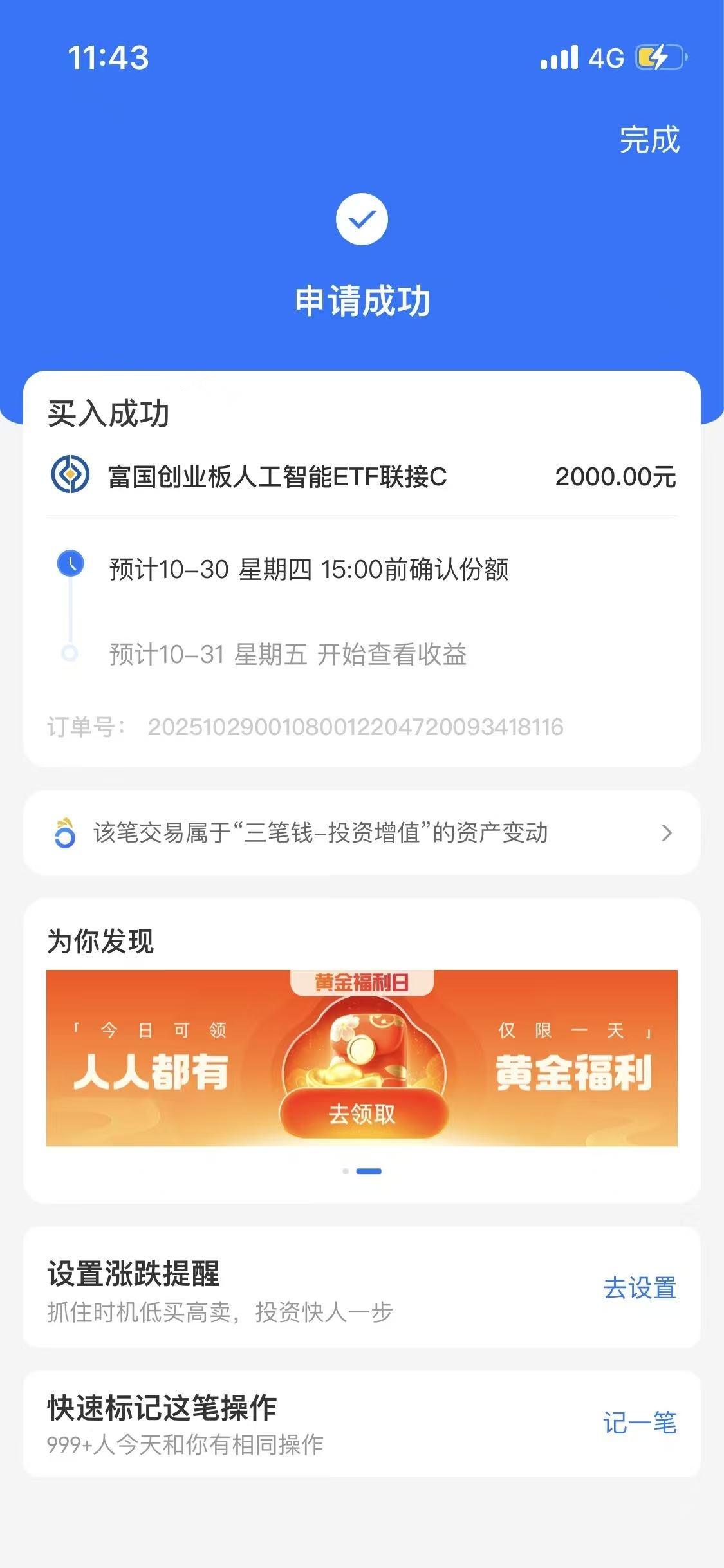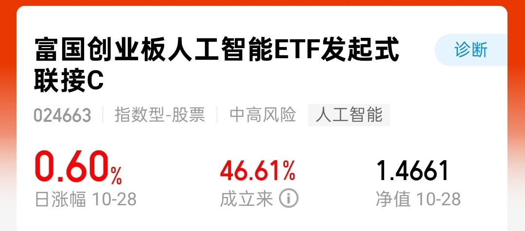 人工智能板块近期热闹非凡,日前发布的“十四五”规划建议中明确提出,要加快人工智能等数智技术创新,并全面实施“人工智能+”行动,这项顶层设计为AI产业的中长期发展指明了方向,注入了强大的政策动力。今天继续加仓2000$富国创业板人工智能ETF发起式联接C$ ,昨日上涨0.6%成立短短三个月涨幅44.34%很不错,随着政策支持和技术革新,我相信人工智能板块会越来越好。