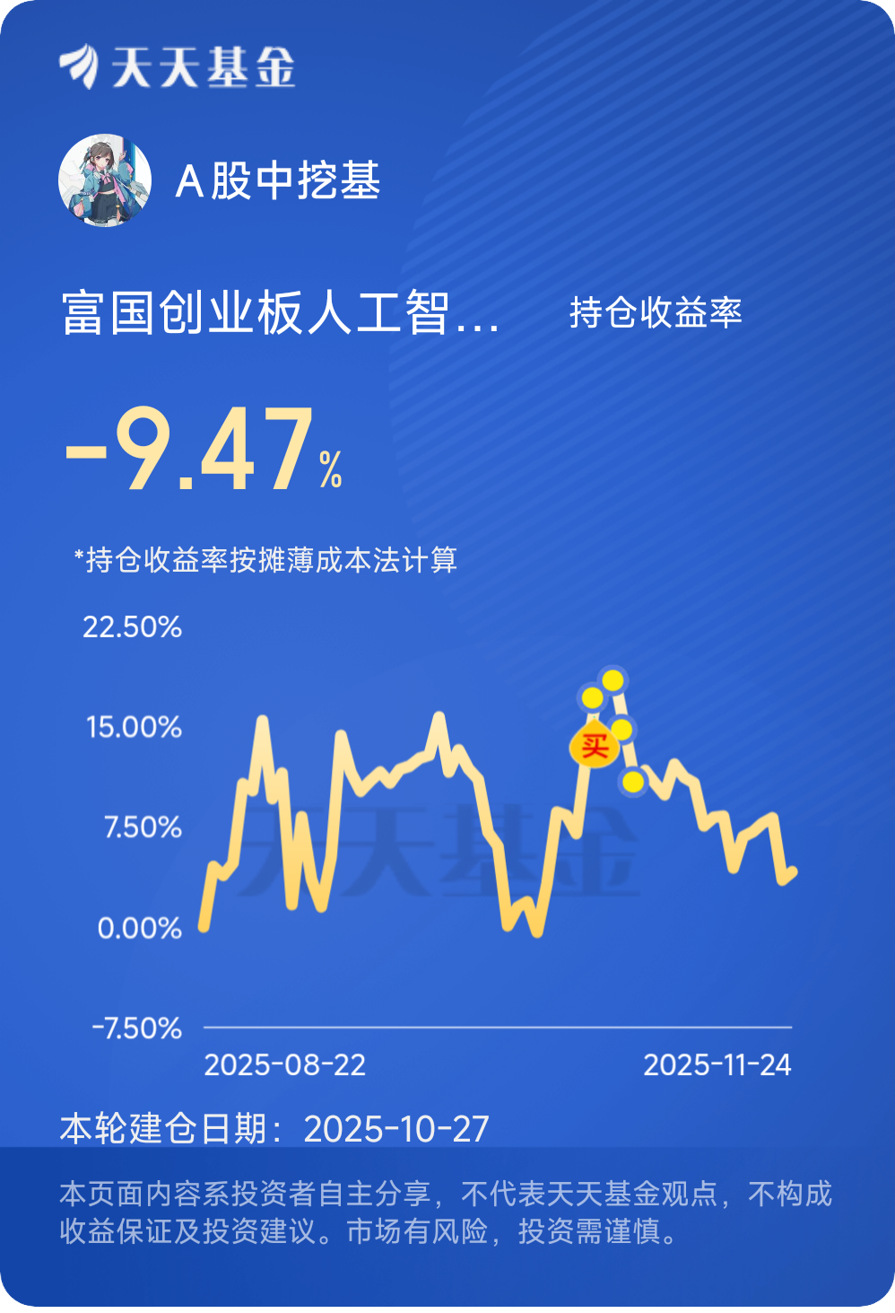 近期持续回调的创业板人工智能板块,今天终于迎来强劲反弹,截止11点创AI指数上涨近5%,我手上的$富国创业板人工智能ETF发起式联接C$ 也终于大回血了一天。