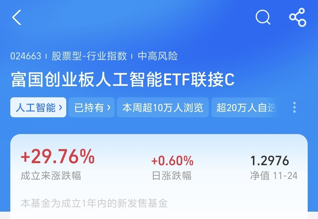 今天市场行情挺不错,创业板人工智能也开始反弹,我打算给$富国创业板人工智能ETF发起式联接C$ 加点。现在人工智能赛道景气度热度很不错,政策、产业、资金三重共振,加上位置也低,所以我觉得是机会。