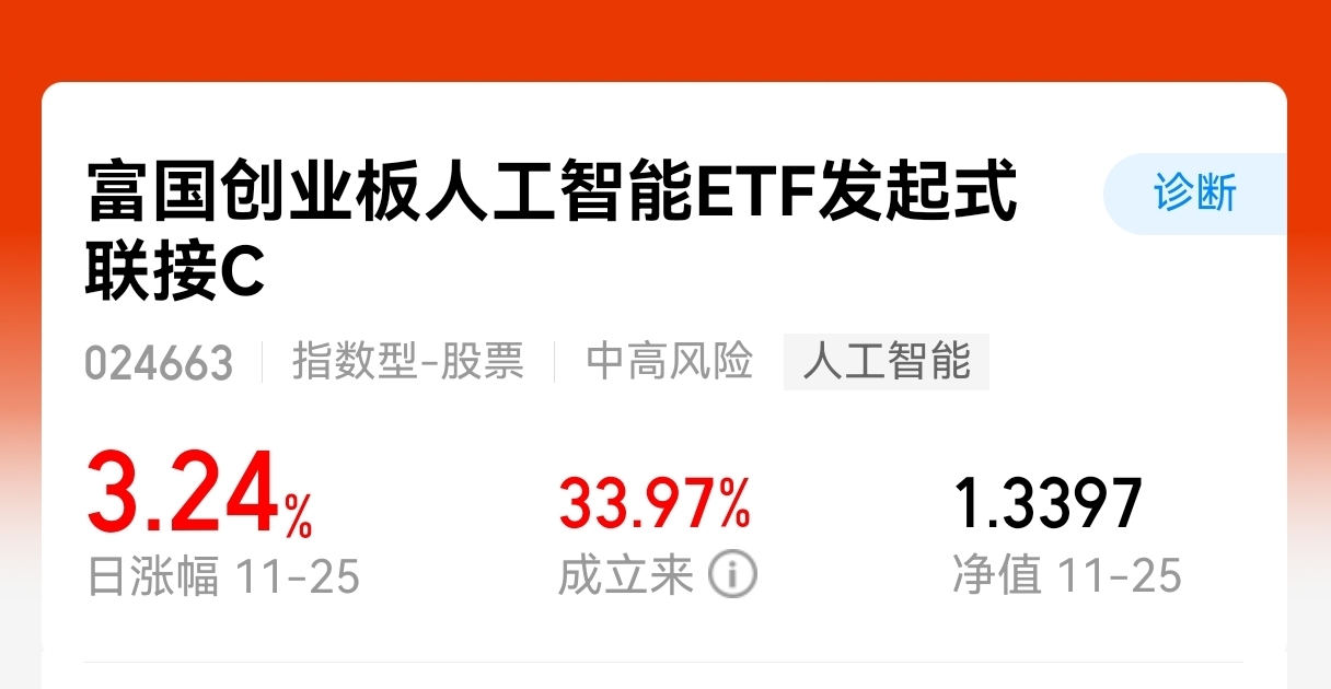 人工智能:加500$富国创业板人工智能ETF发起式联接C$ ,昨天加的今天吃肉了,今日继续上涨,行情真好,目前涨幅5.80%,太给力了,成立以来涨幅33.97%,今日AI产业链延续反弹,光模块CPO、光芯片概念股表现活跃,中际旭创、新易盛等等纷纷走强。随着自主可控需求提升,国产算力有望实现业绩落地,AI加速建设,AI算力产业链各环节需求高景气,继续加仓。