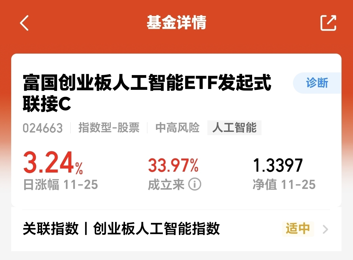 $富国创业板人工智能ETF发起式联接C$ 从业绩表现来看,它虽然成立时间不长,但走势稳中向上,收涨33.97%,我继续看好!